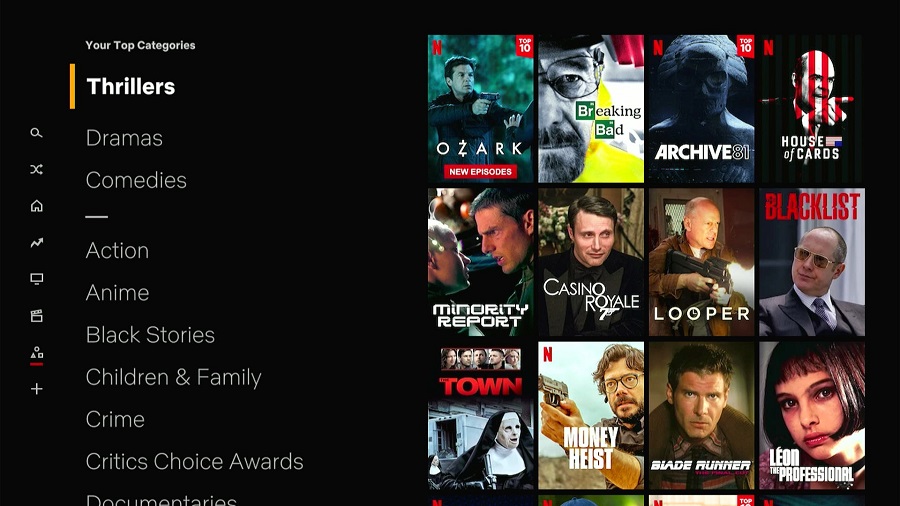While poking around in Netflix, I noticed a new “Categories” section in the left sidebar. Selecting this menu brought up a list of my three most-watched genres, followed by additional genres in alphabetical order, each showing a grid of relevant movies and TV shows.